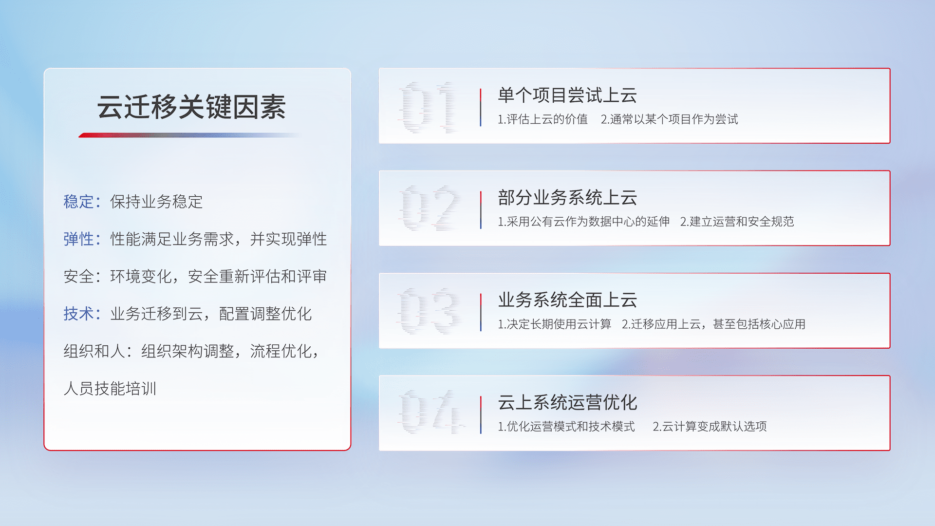 结合实际业务,,,从规划设计、、云平台选型、、、、云原生改造、、数据迁移、、、、集成交付,,,迁移全过程为客户识别最佳上云路径,,,,做好风险识别管理,,设计网络架构、、、、身份权限、、安全审计合规、、操作审计、、日志审计、、、、监控告警策略、、多站点容灾设计等,,对云上基础设施进行整体规划,,,提升IT治理水平,,,以满足弹性、、高可用、、、、高性能的需求。。
